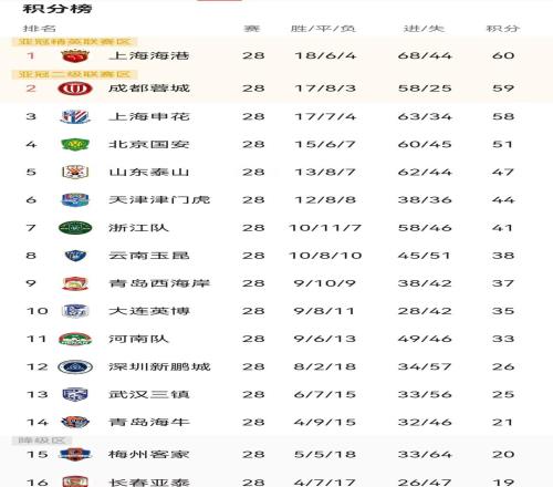 申花22,国安24,蓉城22,中超积分:3队争冠,1队跳出降级区